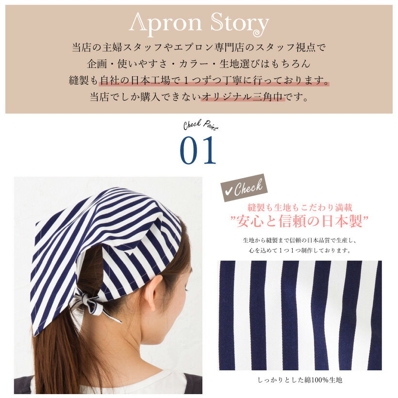 三角部分と紐部分が別に作られているため、着用感が良く、結びやすく、ずれにくいデザインに仕上げた、エプロン専門店ならではの、こだわりの三角巾です。
