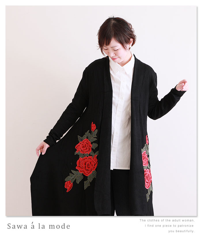 薔薇刺繍が大胆なデザインのカーディガン。アウター カーディガン 刺繍 柄模様 ボタンレス ブラック 春 秋 冬 長袖 ミディアム 可愛い 綺麗め オフィスカジュアル 体型カバー 同窓会 発表会 レディースファッション サワアラモード otona kawaii