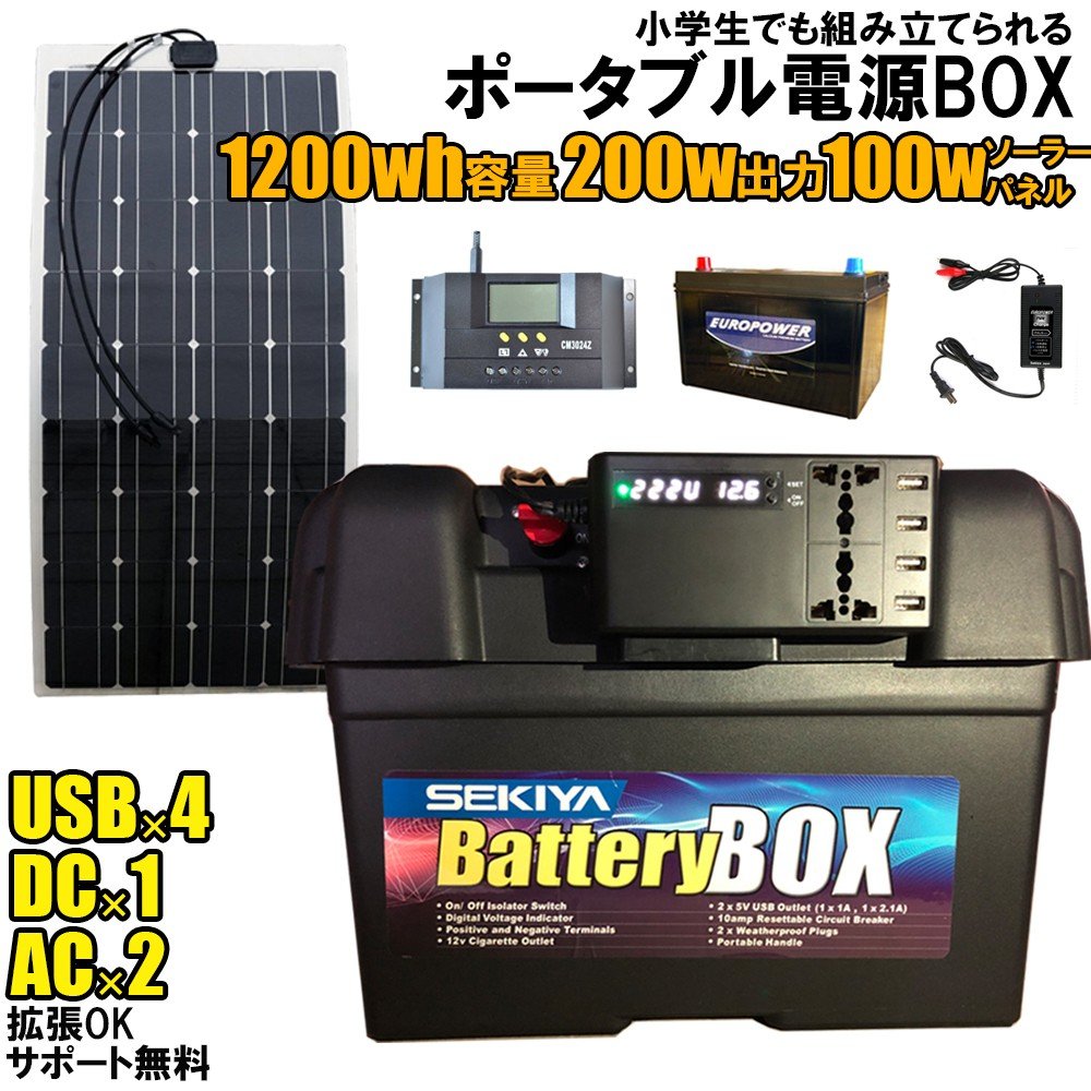 小学生でも組み立てられる簡単配線でポータブル電源に 家庭用ポータブル電源キット 100wフレキシブルソーラーパネル +バッテリーボックス + 1200Wh ポータブル電源 + 200w インバーター +チャージコントローラー 【オススメ商品】