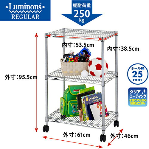 商品シリーズ ルミナスレギュラー(Luminous Regular) 型番 NLH6090-3 アイテムカテゴリ フリーラック/ホームラック サイズモデル ポール径 25mm/幅60 奥行45モデル/3段 外形寸法 アジャスタ装着時:(約)幅61×奥行46×高さ90cmキャスター装着時:(約)幅61×奥行46×高さ95.5cm 棚板 有効内寸 53.5×38.5cm 耐荷重(全体) 500kg 耐荷重(棚板1枚) 250kg 塗装・コーティング クロームメッキ:クリアコーティング(防錆加工) 素材 シェルフ(棚)・ポール:スチール(クロームメッキ)、スリーブ:ABS樹脂 ポール分割 2分割タイプ [上部ポール](約)39.3cm [下部ポール](約)48.7cm ポールの溝の数 33本 セット内容 棚板×3、ポール×4、標準アジャスター×4、ナイロンキャスター×4(ロック付×2、ロックなし×2)、スリーブ(取付部品)13組、スパナ×1 梱包サイズ・重量 (約)92×52×28cm/25.6kg JANコード 4548934252059 アジャスタの仕様 標準アジャスター キャスターの仕様 取り付け時高さ:高さ6.8cm/材質:ナイロン樹脂、スチール(亜鉛メッキ) 備考 耐荷重は、スチールシェルフ(棚板)全面に均等に荷重をかけた場合の値になります。